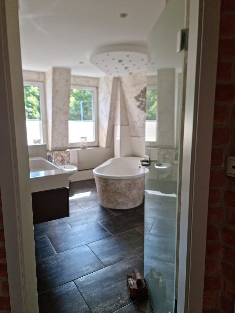 · Badezimmer mit Fußbodenheizung, begehbarer Dusche, Badewanne für zwei, WC, Bidet, Waschtisch